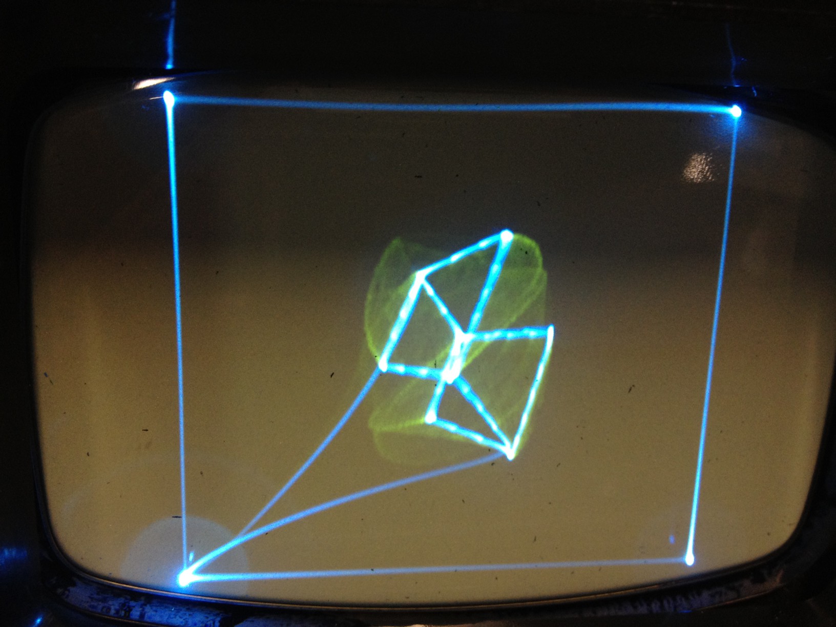 The models are stored in a less-efficient ‘line strip’ format; a list of coordinates is provided with, roughly, “draw to” and “move to” tokens between them. This is less efficient in terms of compute time; think of drawing a cube like this, where corner points will be passed through more than once therefore be calculated more than once. So, it’s slower; but, the advantage is that you can be moving the beam while you calculate. As it’s drawing as it thinks, there is no need for the beam to sit still burning a hole in the screen in a ‘calculate’ pass. There are brighter points at each line end, which correspond to the beam ‘lingering’ as the next point is calculated (which takes noticeable time). But, I think the ‘constellation’ effect is quite nice. And since the lines are drawn whilst points are calculated, no RAM is required to store intermediate points, thus all the RAM is now free to download models via serial.