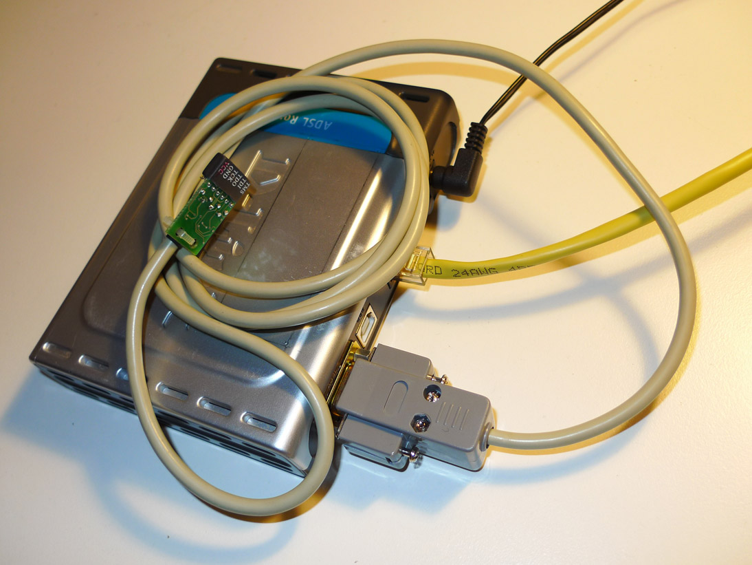 An ethernet JTAG pod made from an old D-Link ADSL router, used to program Xilinx FPGAs in lieu of a parallel port.